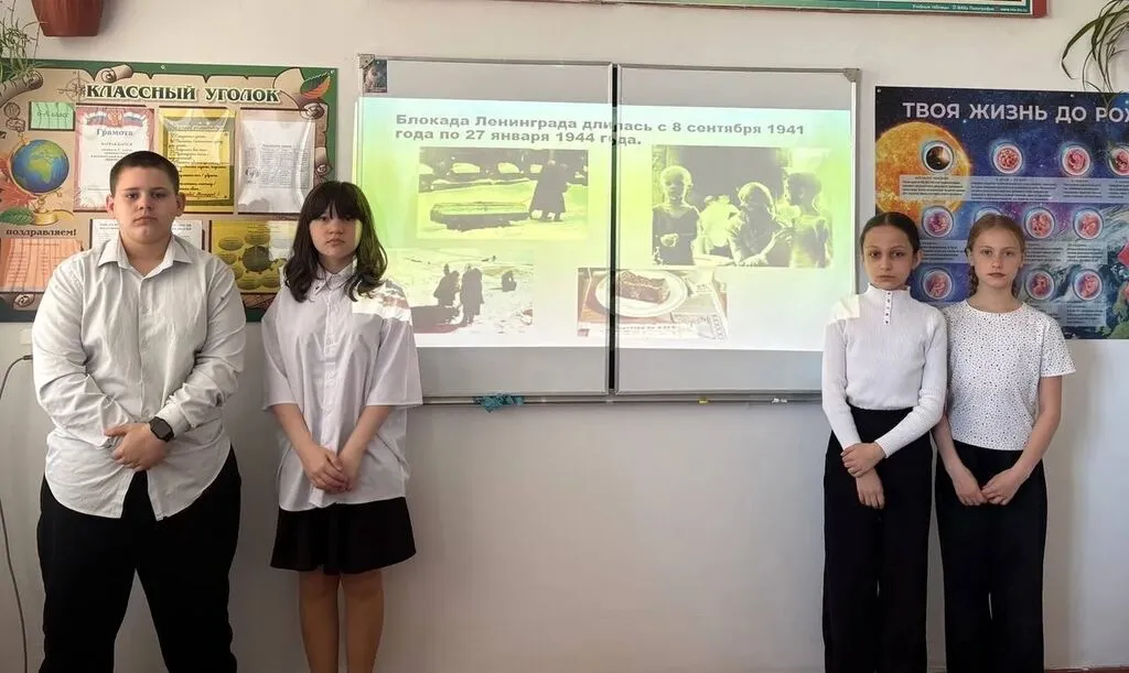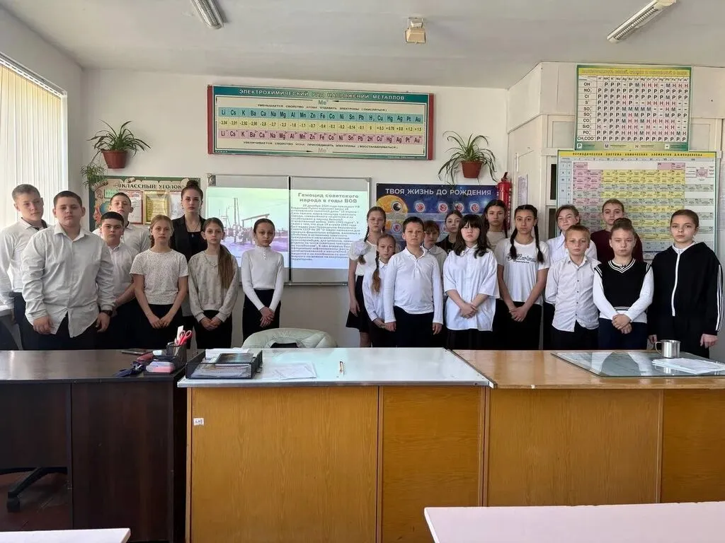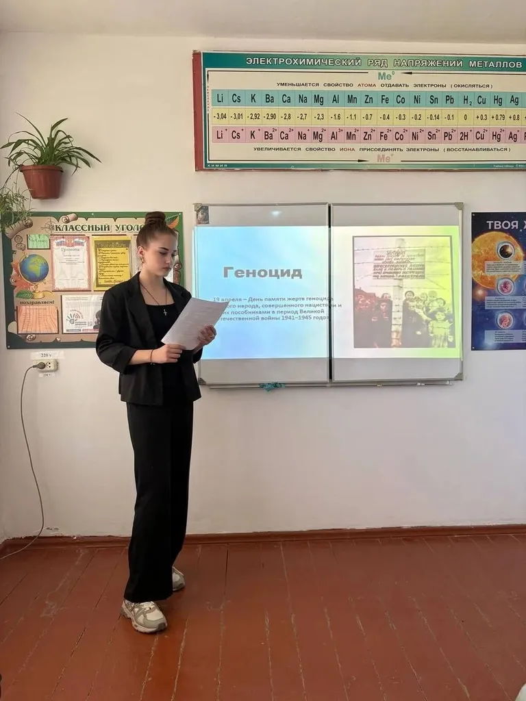 В начале занятия заместитель президента школы,Погребова Ангелина Александровна, познакомила ребят с трагическими страницами истории — геноцида советского народа, совершённом нацистами и их пособниками в годы Великой Отечественной войны 1941–1945 годов.
