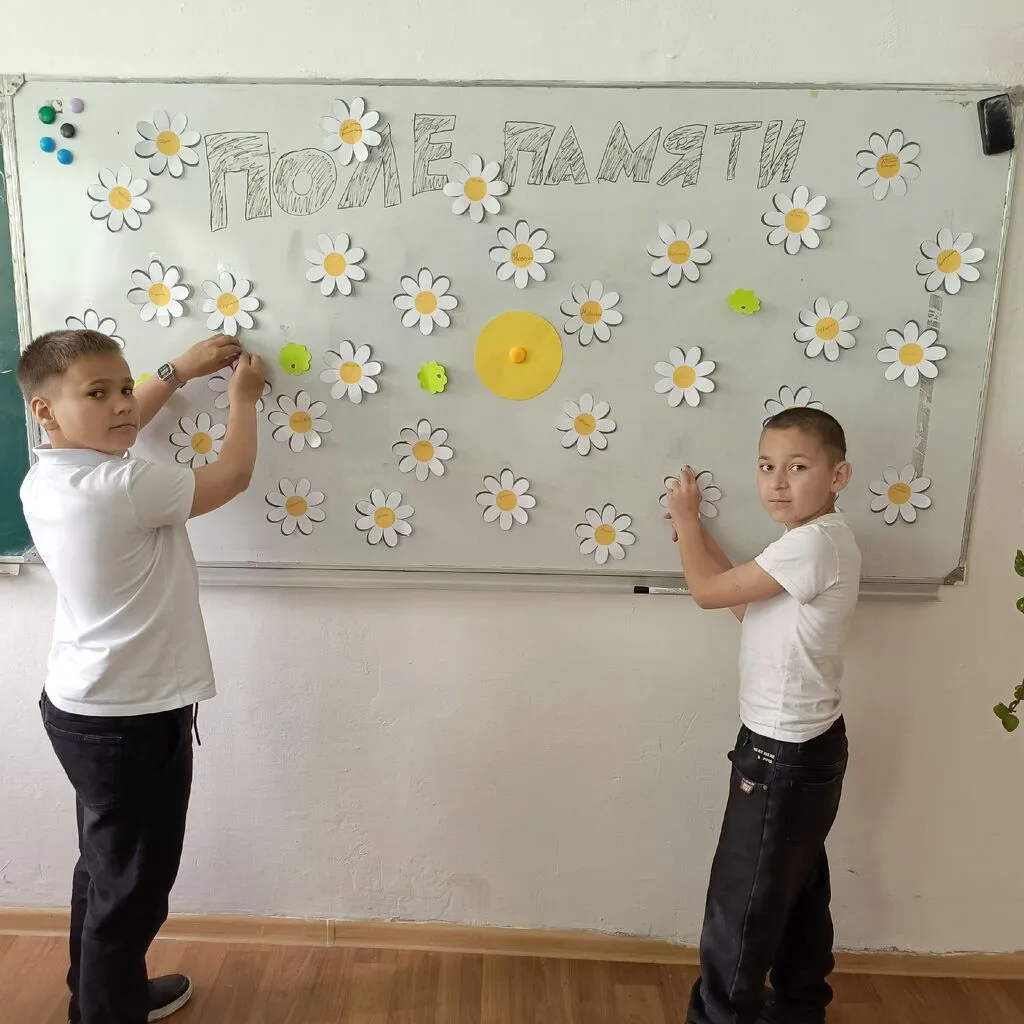 Дети разместили ромашки на доске, превратив ее в настоящее «Поле памяти» - символ единства, уважения к прошлому и стремления к светлому будущему.